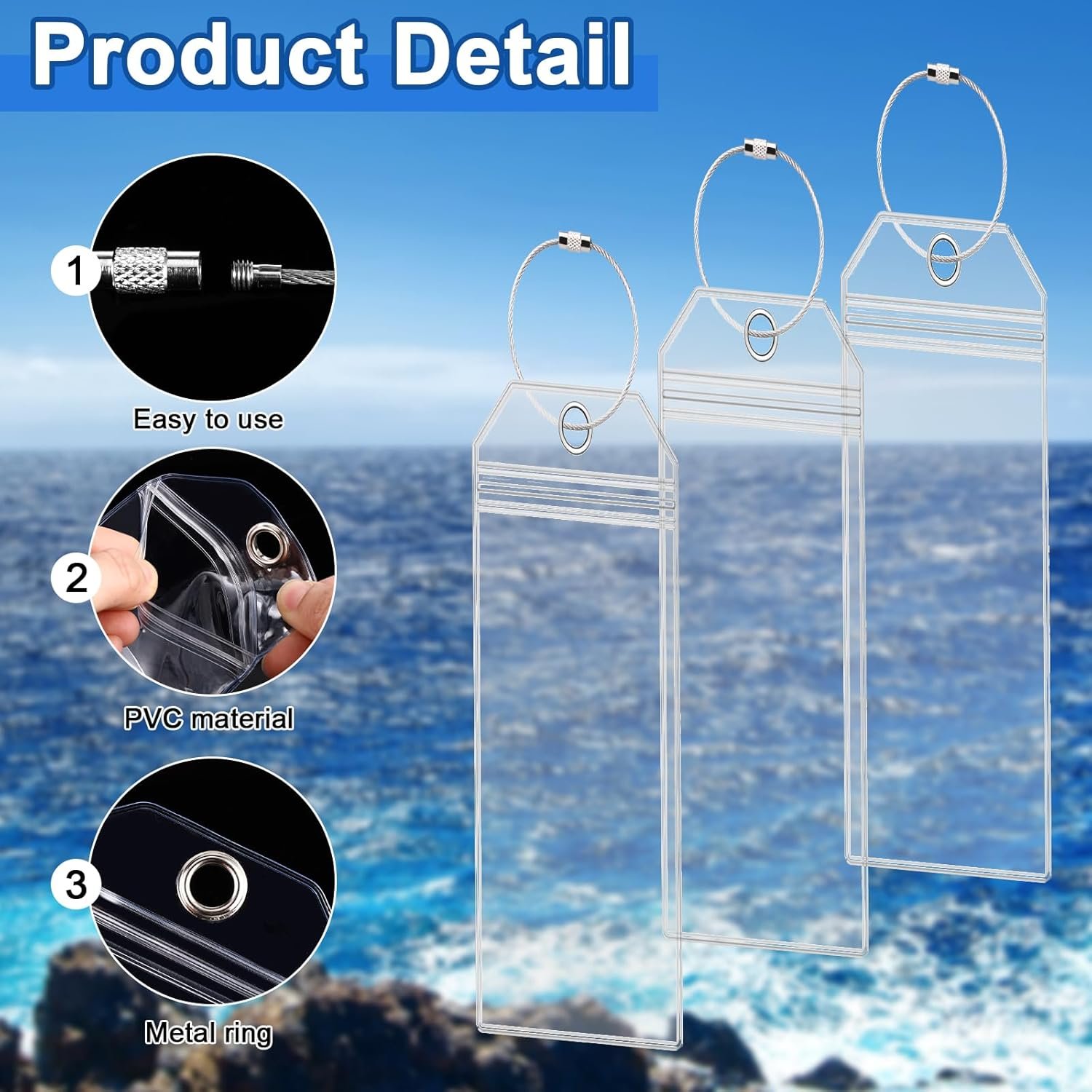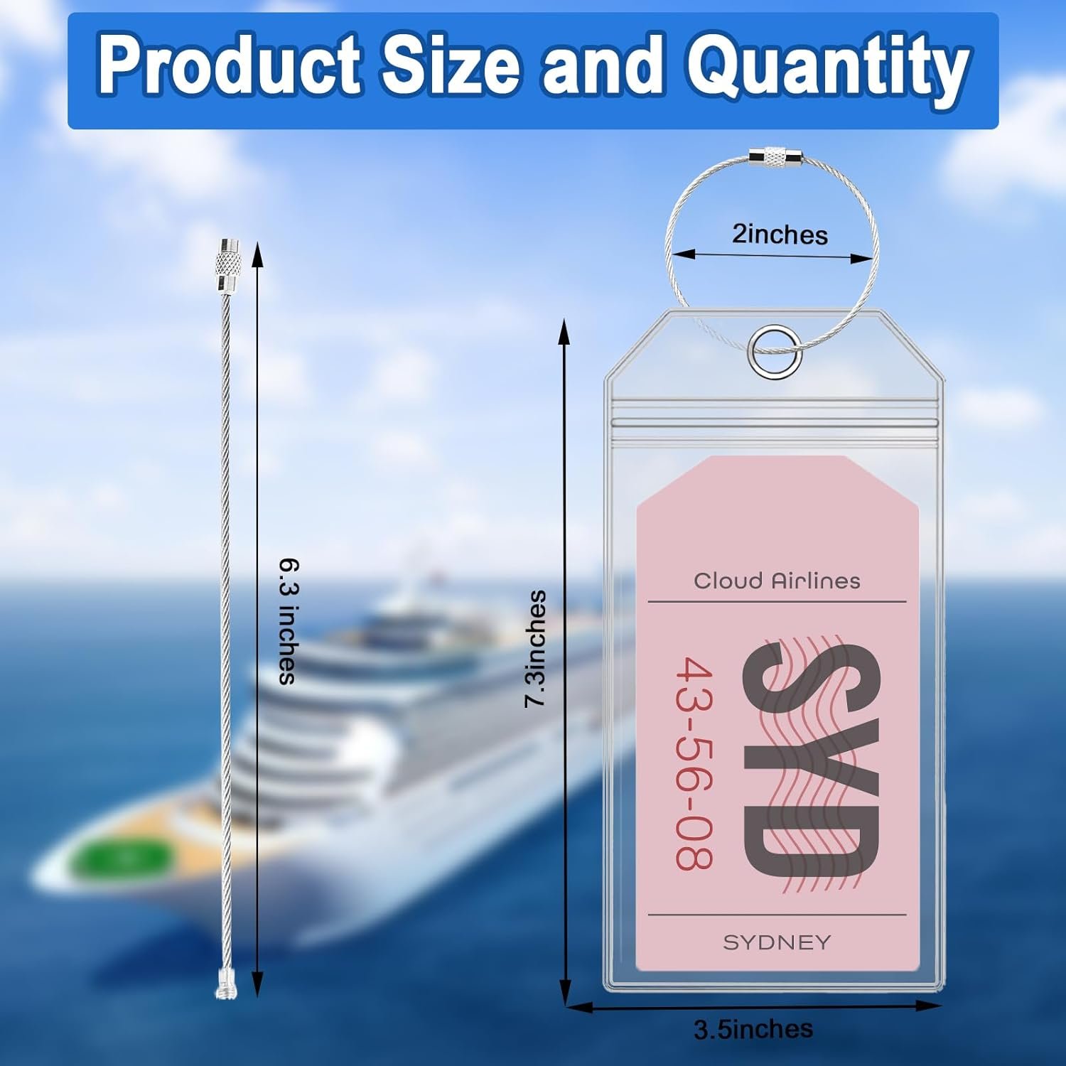 Size: clear cruise luggage tag: 3.5 x 7.3 inches, steel loop: 6.3 inches
