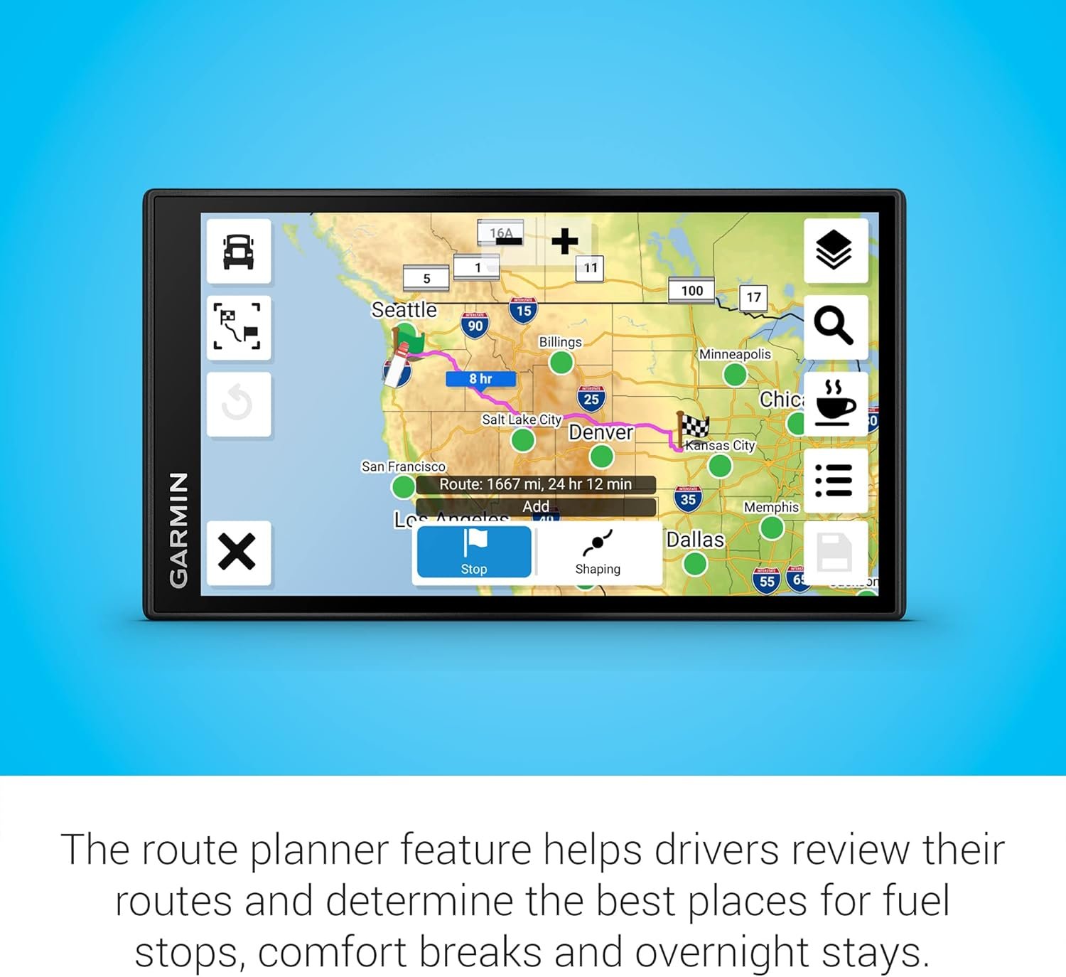 The route planner feature helps drivers review their complete routes and determine the best places for fuel stops, comfort breaks and overnight stays