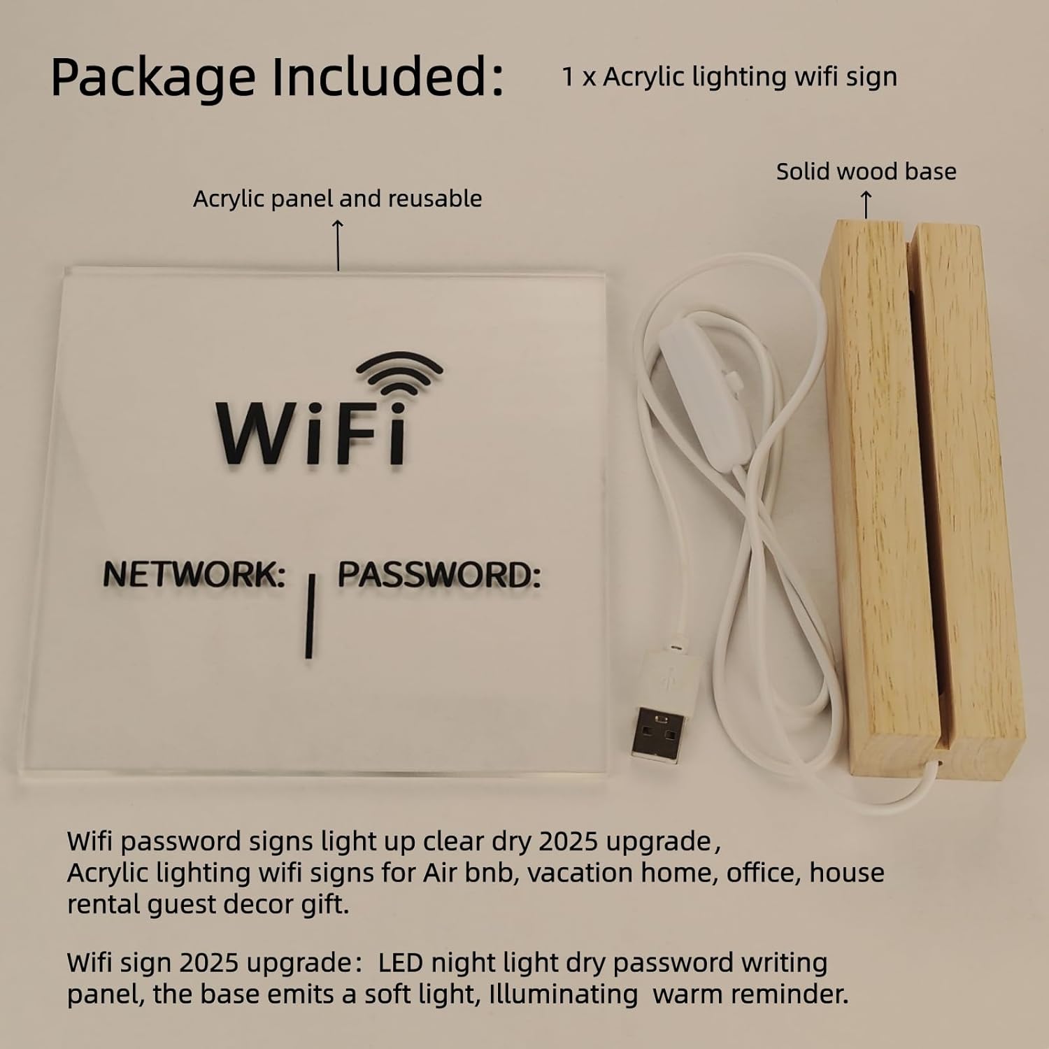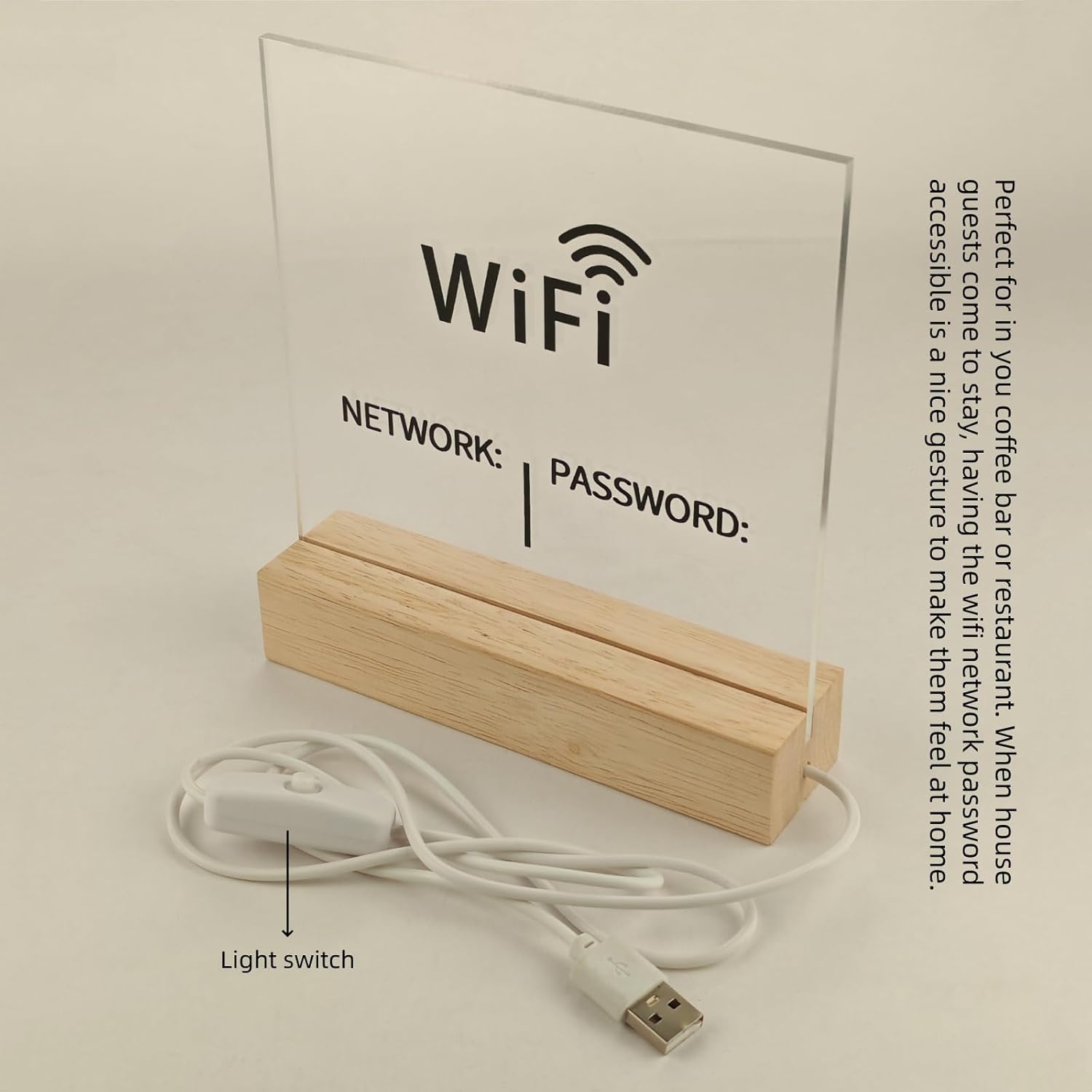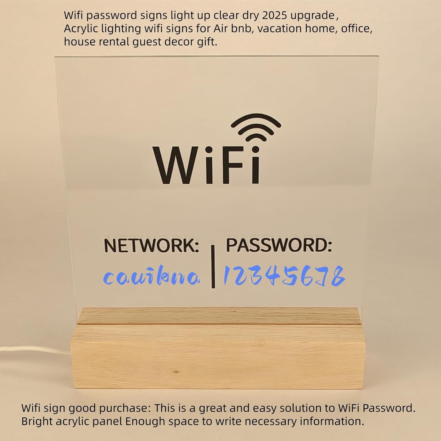 Wifi sign good purchase:This is a great and easy solution to WiFi Password. Bright acrylic panel panel Enough space to write necessary information.